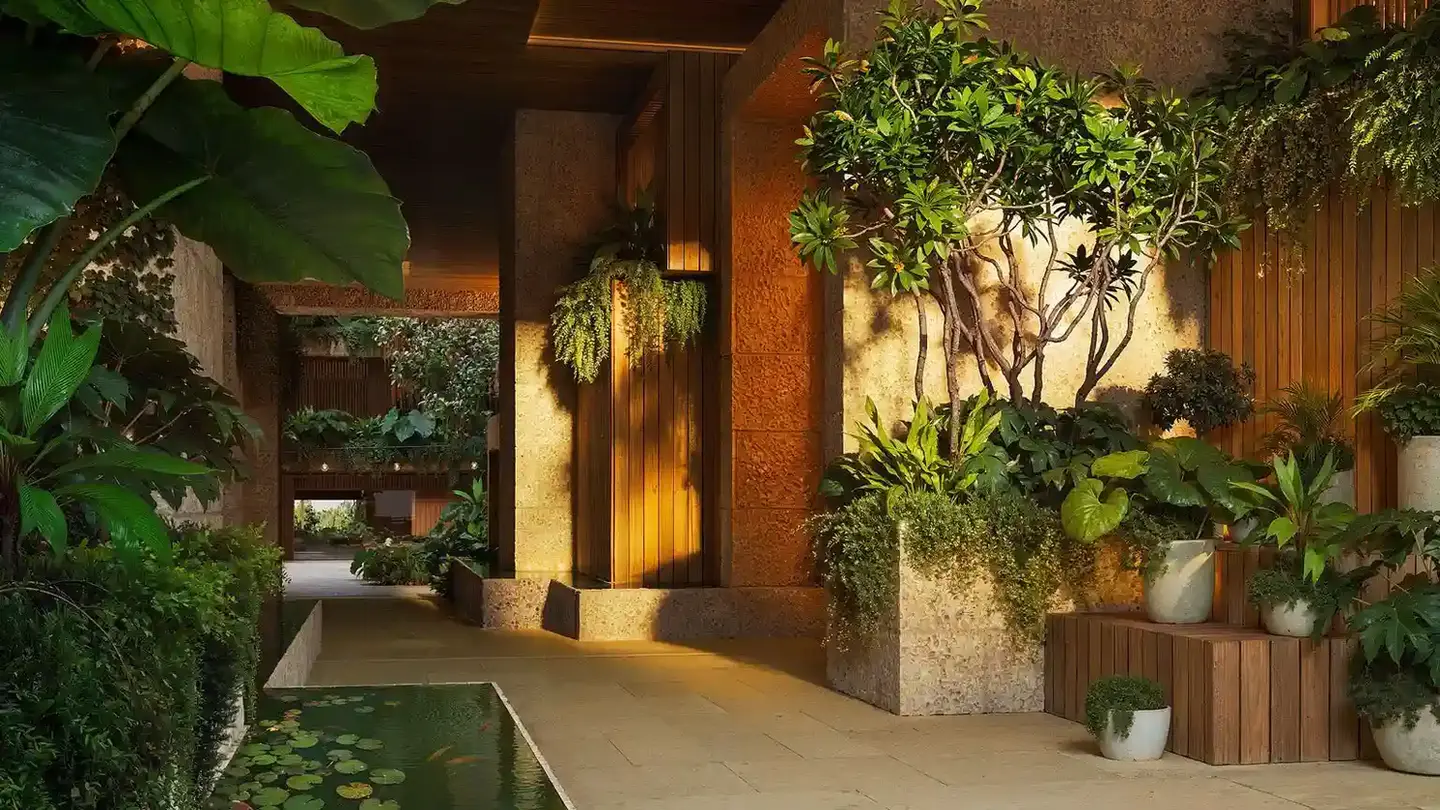 The striking architecture, deep terraces adorned with lush plants, and a limestone façade accented with wood elements form a memorable look that naturally complements the tropical landscape.